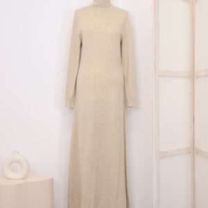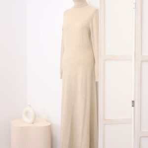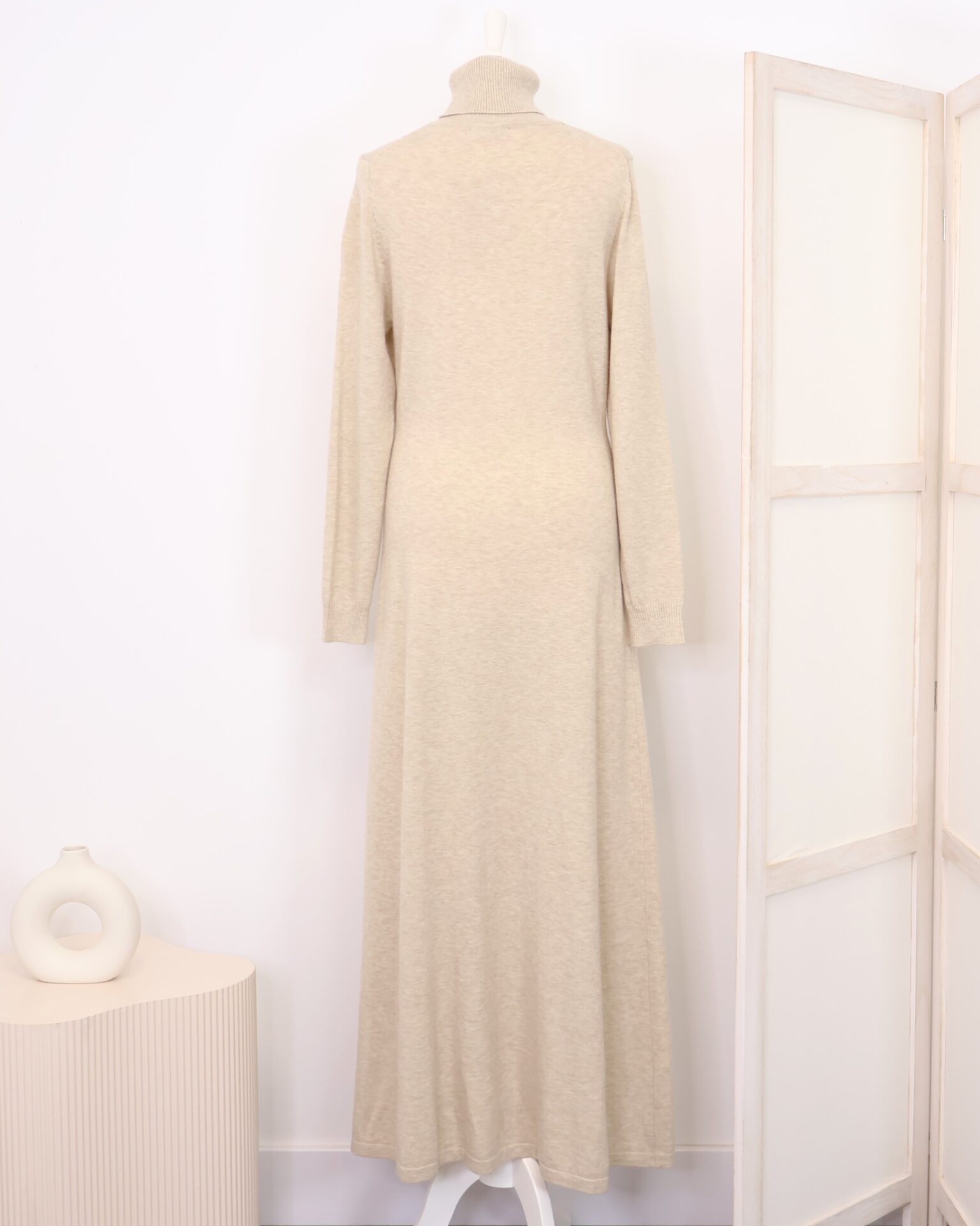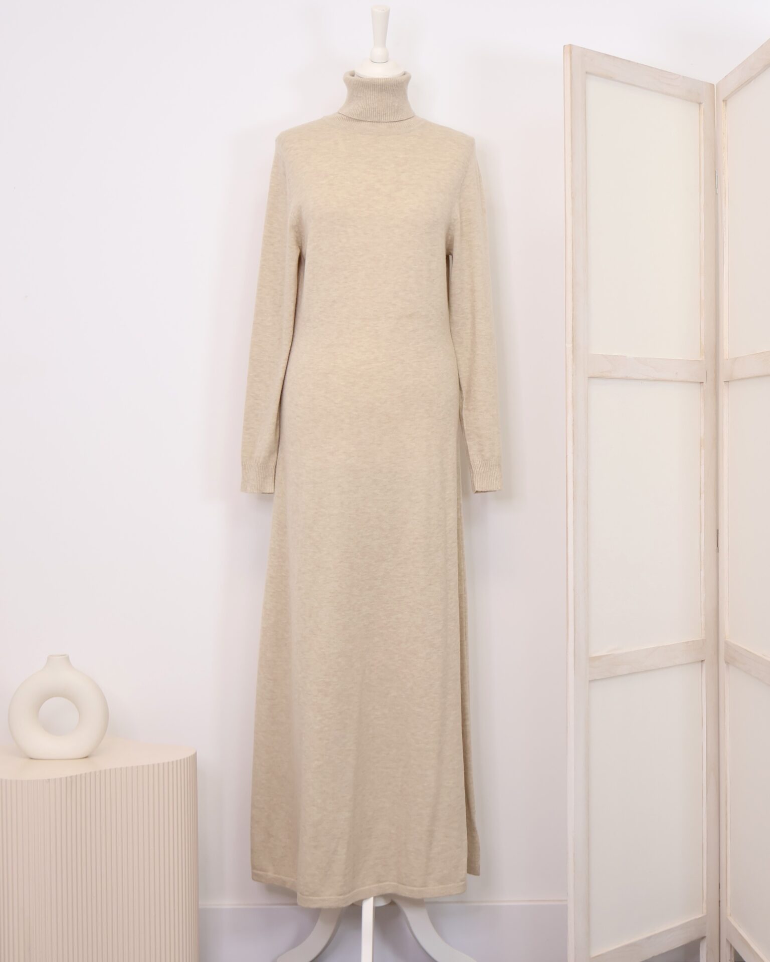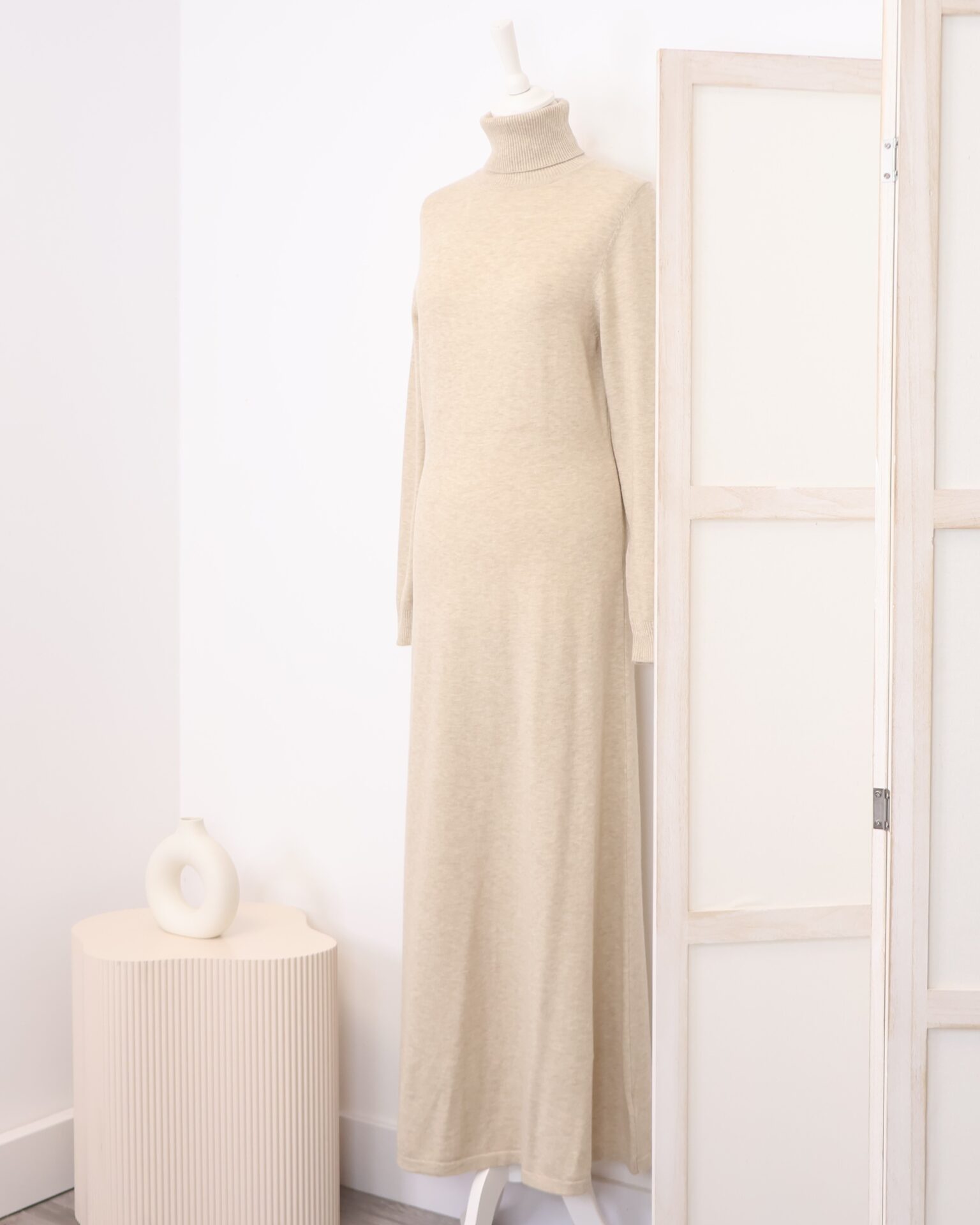 Vestido beige confeccionado en tejido de punto elástico con cuello vuelto.