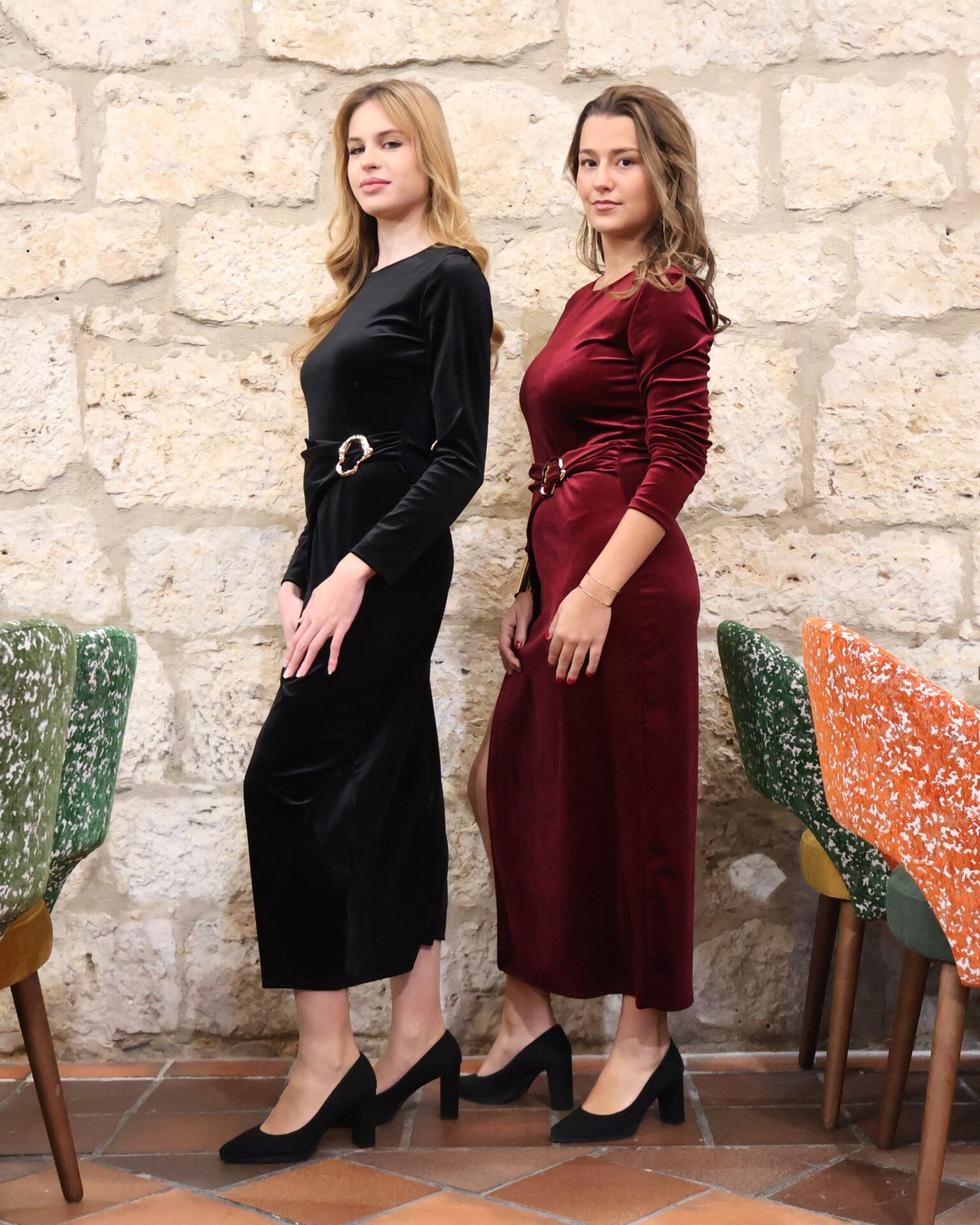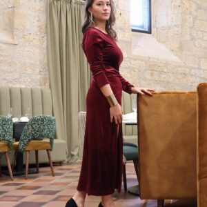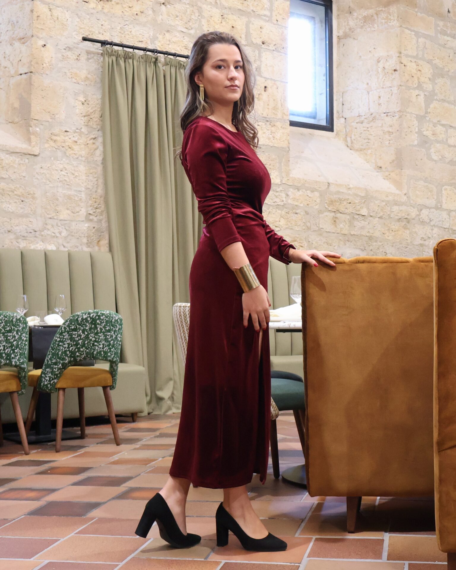 Vestido largo de terciopelo en color burdeos con manga larga. Tejido elástico y suave con un diseño ajustado que realza la figura sin perder comodidad, mientras que la abertura lateral añade un toque sensual y moderno.