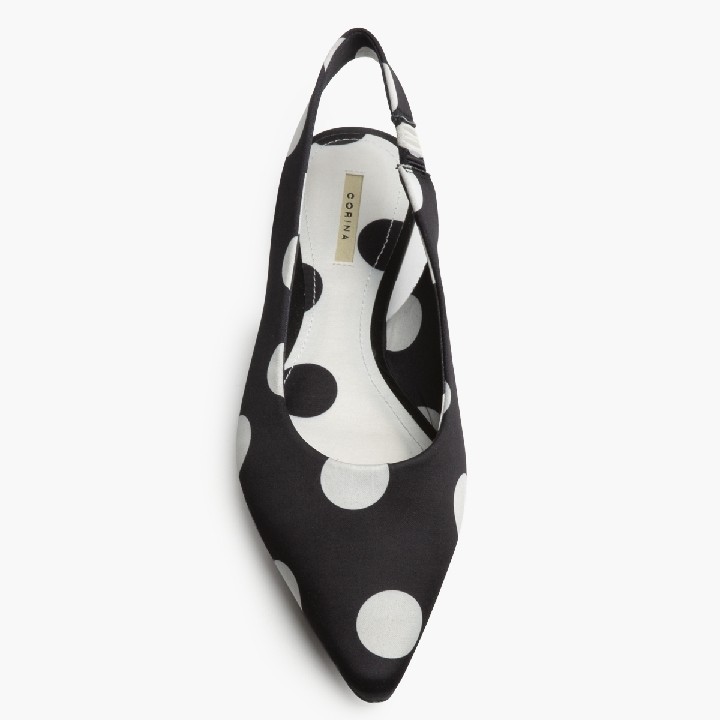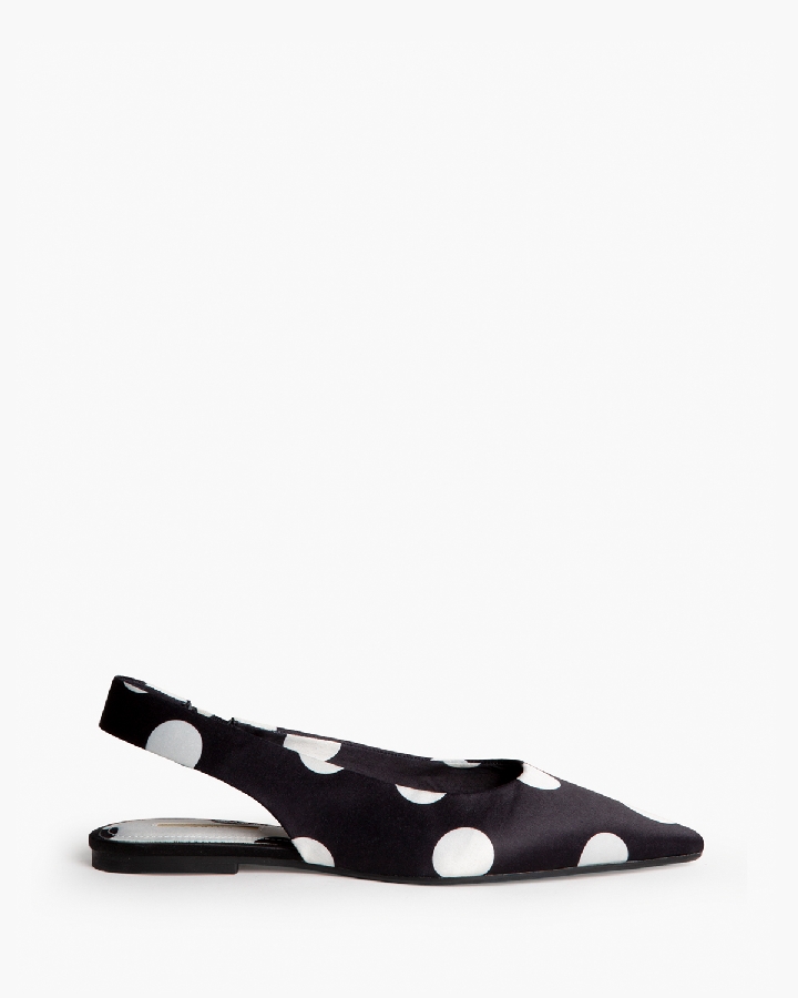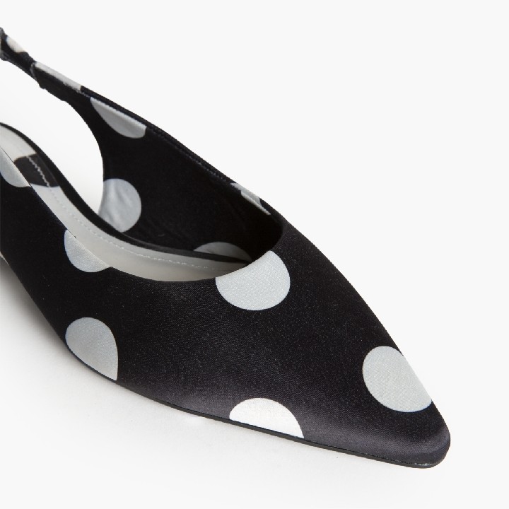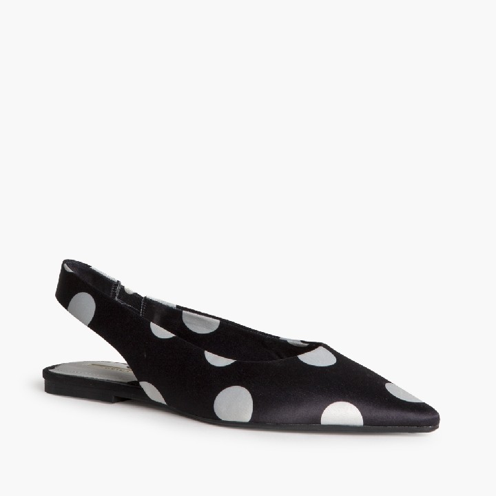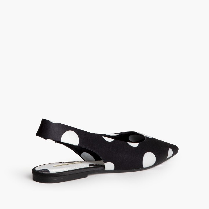 Sandalia plana, corte en satén, con polka dot. Acabado en punta.