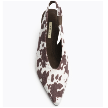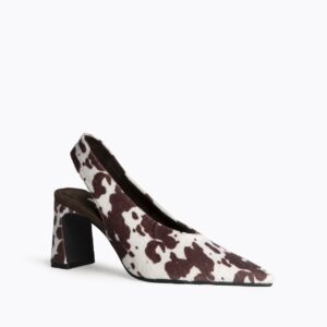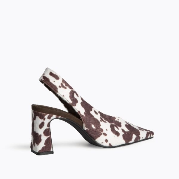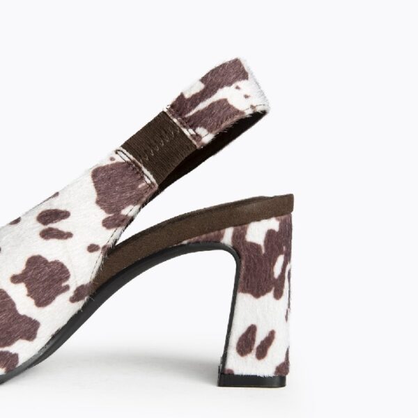 Zapato de tacón corte salón destalonado fabricado en material de pelo con estampado print de vaca. Horma en punta fina. Cierre mediante tira trasera con extremo en elástico. Tacón ancho forrado de 7 cm.