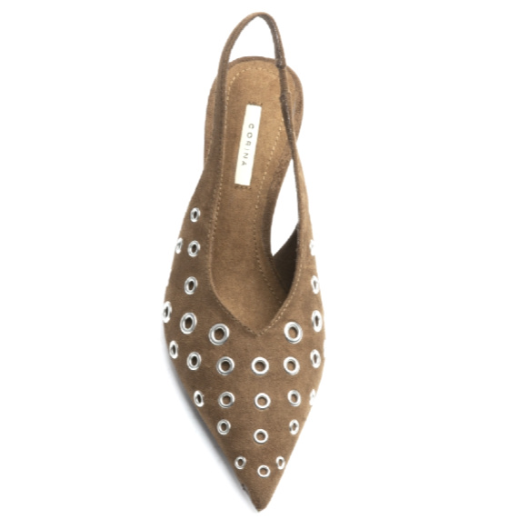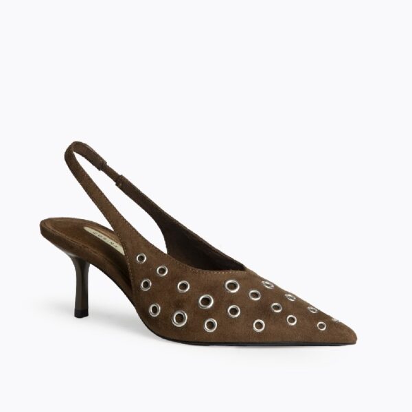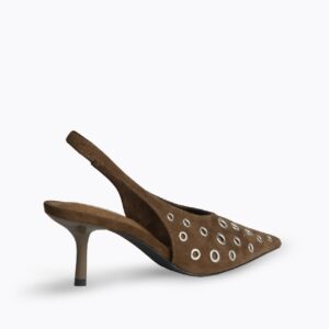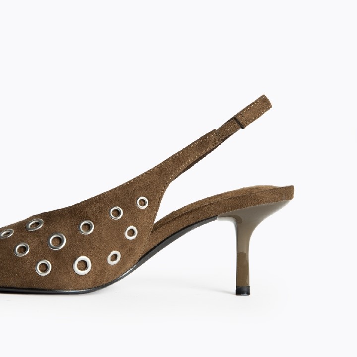 Zapato de tacón con corte salón destalonado. Fabricado en antelina con detalle de arandelas en color plateado. Horma en punta fina. Cierre mediante tira trasera con extremo en elástico para facilitar el calce. Forro y plantilla acolchada. Suela de goma, material flexible y tacón fino de 6 cm.